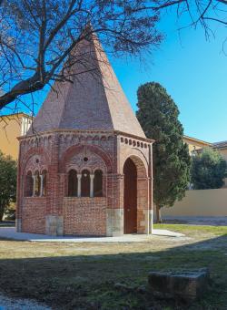 Di piccole dimensioni, presenta una pianta ottagonale equilatera, sormontata da una cuspide piramidale, completamente in mattoni. In laterizi è realizzato anche il resto della struttura, i cui lati sono scanditi da pilastri aggettanti e da arcate cieche a tutto sesto, impostati su un basamento in pietra squadrata, la cui altezza aumenta gradualmente da est verso ovest, denotando un probabile rifacimento della struttura originaria.