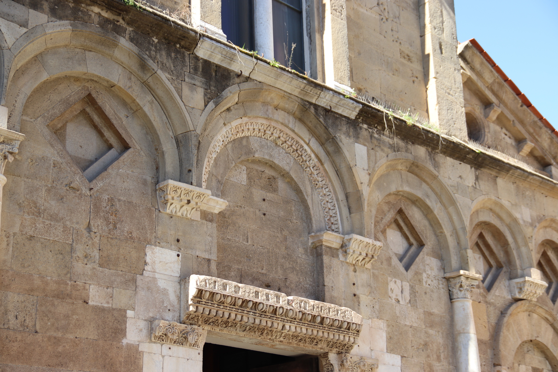 Ricordata come esistente già nel 1061, ha nella facciata le forme tipiche dell’architettura pisana con evidenti segni dello stile di Busketo, a cui è attribuita la costruzione dell’edificio. Il materiale utilizzato è in gran parte tufo, con inserti in marmo, spesso di spoglio, come l’architrave decorato, databile IV secolo. A sinistra del portale d’ingresso della chiesa, all’altezza dello sguardo, si vedono incisi dei caratteri greci, †ɱ⧩h⧩Ʌ⧩, presenti su altri due monumenti della città, il Battistero di San Giovanni e la Chiesa dei SS. Cosma e Damiano, per il cui significato sono state formulate dagli studiosi svariate ipotesi.