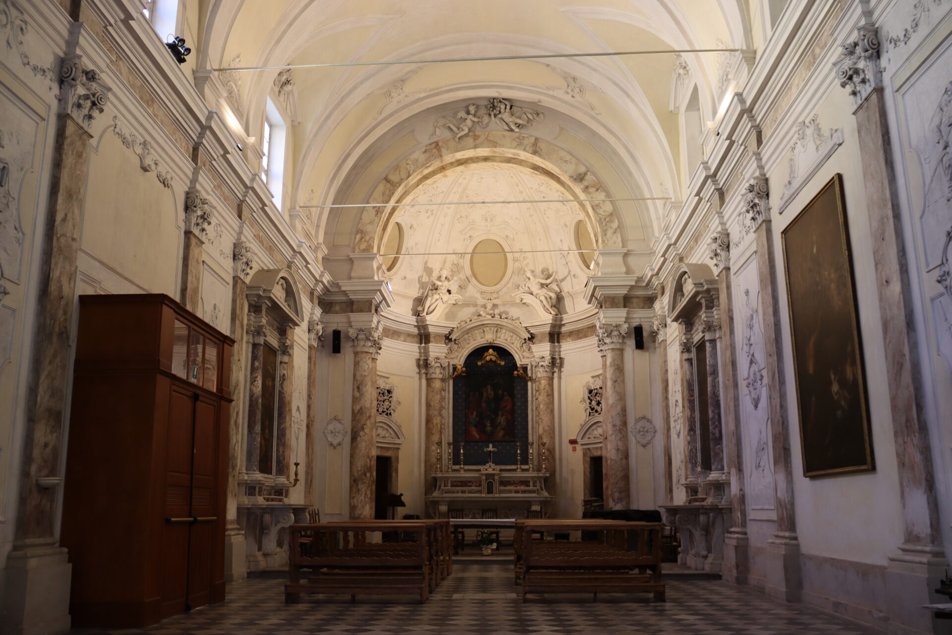 L’interno è ad aula unica, preceduto da un atrio su quattro colonne con volta a crociera. Sopra è collocato un organo eseguito nel 1850 da Nicodemo Agati. Le pareti presentano finestre ornate con cornici a stucco e dodici riquadri, sempre in stucco bianco, raffiguranti Santi e Profeti, eseguiti nel 1747 da Giovanni Frullani, come le restanti decorazioni.