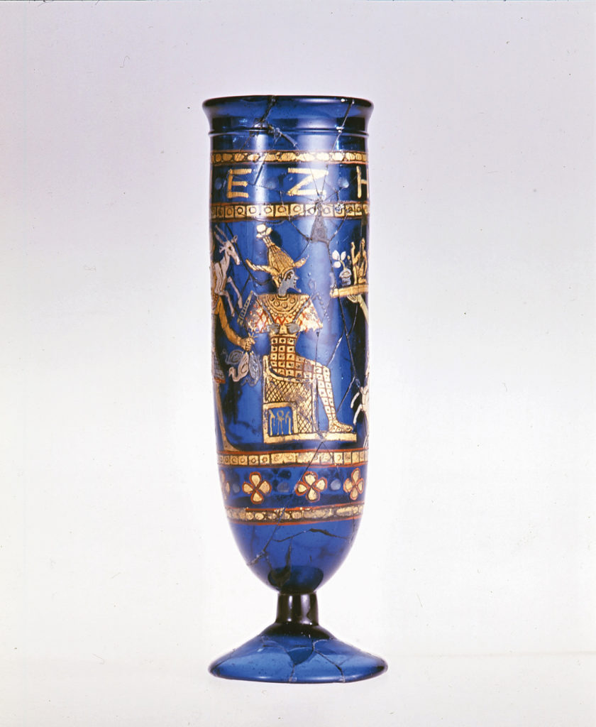 Uno dei pezzi più preziosi della collezione. Ornato da una decorazione figurata, policroma e dorata, d’ispirazione faraonica, e da una iscrizione in caratteri greci che dice “Bevi e tu possa vivere!”. Il calice è da collocare tra i capolavori della produzione vitrea d’età romana (III sec. d.C.), ma perché quella iscrizione e qual è il vero significato?