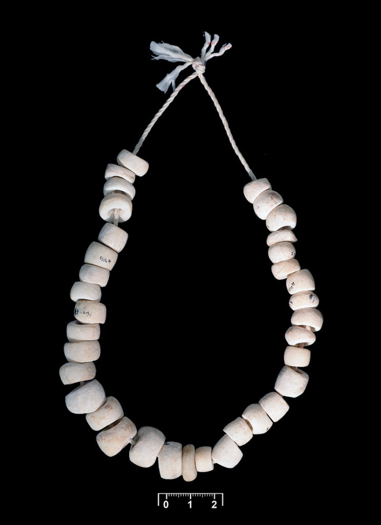 Questa collana in marmo risale all’Età del Rame (in Italia dalla seconda metà del IV millennio fino al II millennio a.C.) e proviene dalla Grotta del Castello di Vecchiano (Pisa). Nella grotta sono state ritrovate le sepolture di nove adulti e un bambino, accompagnate dagli oggetti più cari che avevano posseduto in vita: ornamenti in conchiglia, strumenti in osso e pietra, contenitori in ceramica, un pugnale e una lamina di rame. Questi corredi, oggi conservati presso la Gipsoteca di arte antica, formano uno dei complessi più ricchi della Toscana nord-occidentale.