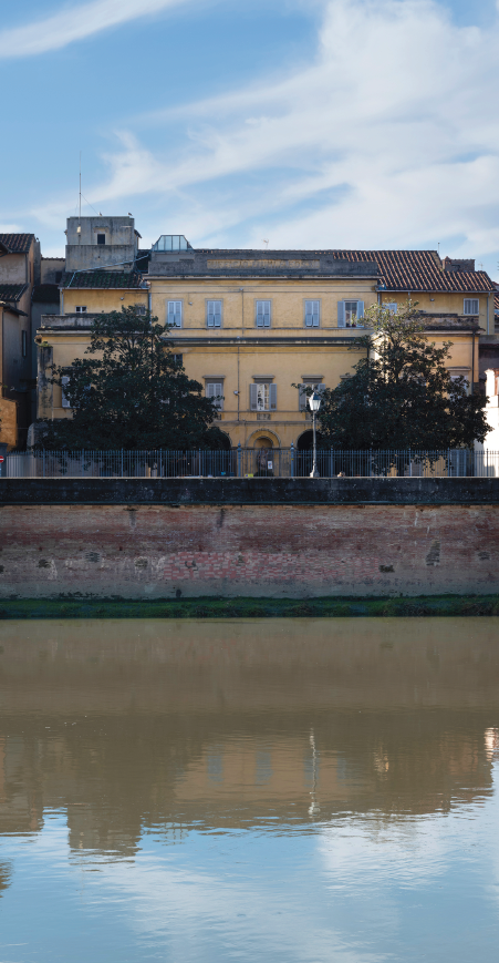 Il giardino che si affaccia sull’Arno alle spalle del Palazzo Franchetti di via San Martino – oggi sede del Consorzio 4 Basso Valdarno (già Fiumi e Fossi) – rappresenta una vera e propria anomalia in un tratto d’insediamento densamente occupato da oltre un millennio, dapprima da torri e case-torri medievali e poi dalle residenze dell’aristocrazia pisana di Età moderna. Non vi sono vuoti nella fitta trama edilizia, e la viabilità diretta al fiume è sovente ridotta a percorsi angusti, talvolta coperti da strutture sovrastanti con le quali si sfruttava ogni spazio disponibile. Secondo una lunga tradizione lì sorgeva la dimora del conte Ugolino della Gherardesca, distrutta dopo la caduta della sua signoria il I luglio 1288, e perciò l’area era rimasta libera da costruzioni: ne è eco l’atto notarile del 1833 con cui la proprietà del bene passò ai Franchetti, ricca famiglia di Ebrei livornesi, ove si ricorda che tale edificio «sarebbe stato demolito con l’apposizione solita del sale».
