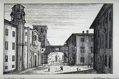 Incisione di Bartolomeo Polloni raffigurante La Torre della Verga d’oro a Pisa vista dal lato della chiesa di San Nicola e a destra il Palazzo Reale, 1834